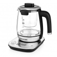 Мощность 1000 Вт, максимальный объем 1.7 литра, колба для заваривания чая, скрытый нагревательный элемент, поворачивающийся на 360° корпус, шкала уровня воды, электронное управление, 11 функций кипячения и подогрева воды для разных сортов чая от 40 до 100 °С, поддержание заданной температуры, автоотключение при достижении заданной температуры, отключение при отсутствии воды, корпус из высокопрочного термостойкого стекла, цвет: нержавеющая сталь