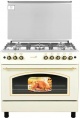 Габариты (В*Ш*Г): 85*90*60 см, 5 газовых конфорок, чугунные решетки, электроподжиг, стеклянная крышка поверхности, электрическая духовка, объем духовки: 110 литров, термостат, 2 стекла дверцы духовки, освещение духовки, цвет: бежевый