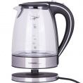 Мощность 2200 Вт, максимальный объем 1.7 литра, фильтр от накипи, скрытый нагревательный элемент, поворачивающийся на 360° корпус, шкала уровня воды, автоматическое отключение при закипании воды, защита от перегрева, корпус из термостойкого стекла, внутренняя подсветка корпуса, цвет: черный / серебро