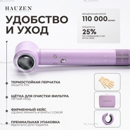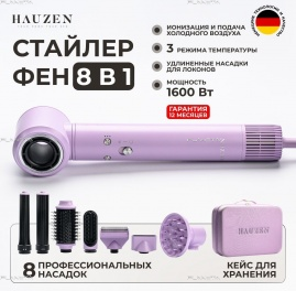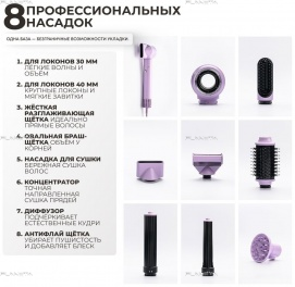 Фен-щетка, мощность 1600 Вт, 3 скорость воздушного потока, 4 температурных режима, функция "холодный обдув", насадка для локонов 30 мм, насадка для локонов 40 мм, щетка, овальная щетка, насадка для предварительной сушки, насадка-концентратор, диффузор, антифлай насадка, плазменная ионизация, защита от перегрева, длина сетевого шнура 3 метра, фирменная коробка, перчатка и щетка для чистки фильтра, цвет: сиреневый