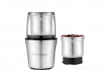 Мощность: 200 Вт, вместимость: 70 г./200 мл, импульсный режим, 2 чаши в комплекте для кофе, орехов, ножи из нержавеющей стали, серебро