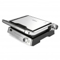 Мощность 2000 Вт, индикация сети и нагрева, размер поверхности гриля: 287x260 мм, съёмные панели, антипригарное покрытие рабочей поверхности, регулировка температуры до 230°С, режим барбекю 180°, съёмный поддон для сбора жира 200 мл, цвет: серебристый / черный