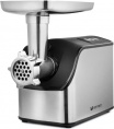 Мощность 1800 Вт, 2.3 кг/мин, перфорированные диски: 3, 5 и 7 мм, насадки для приготовления колбас и кеббе, овощерезка с тёрками и насадками для шинковки, корпус: пластик, функция "Реверс", 2 скорости работы, серый/черный