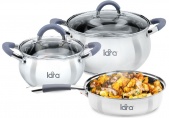 Набор посуды Lara LR02-102 Bell пригодится на каждой кухне. В комплект входит 2 кастрюли с крышками из жаропрочного стекла и сотейник объемом 2.5 л. Диаметр кастрюль составляет 18 см и 24 см, а их объем равен 2.7 л и 6.1 л соответственно. Дно особой конструкции не только обеспечивает быстрый и равномерный прогрев блюд, но и позволяет использовать такую посуду на плитах различных типов, в том числе и индукционных. Набор посуды Lara LR02-102 Bell произведен из качественной нержавеющей стали толщиной 0.5 мм. Этот материал отличается долговечностью и полностью безопасен для пищевых продуктов. Мерная шкала внутри кастрюль позволяет легко ориентироваться по объему жидкости. Специальное покрытие ручек предотвращает их выскальзывание и не дает случайно обжечься.