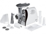 Мощность 1800 Вт, 2 кг/мин, перфорированные диски для мяса: 3, 5 и 7 мм, функция "реверс", насадки для кеббе и колбас, насадка для отжима томатного сока, металлический лоток, цвет: белый